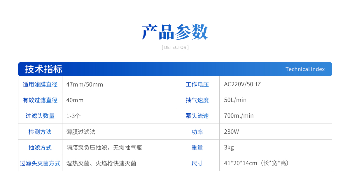 | 1、適用濾膜直徑:47mm/50mm 2、有效過濾直徑:40mm 3、過濾頭數量:1-3個; 4、檢測方法:薄膜過濾法 5、抽濾方式:隔膜泵負壓抽濾,無需抽氣瓶 6、過濾頭滅菌方式:濕熱滅菌、火焰槍快速滅菌 7、尺寸:41*20*14cm(長*寬*高) 8、重量:3kg 9、功率:230W 10、工作電壓:AC220V/50HZ 11、噪音小于30dB 12、物理按鈕開關 13、可選擇單頭、三頭結構,選型豐富 14、抽氣速度:50L/min 15、泵頭流速:700ml/min |