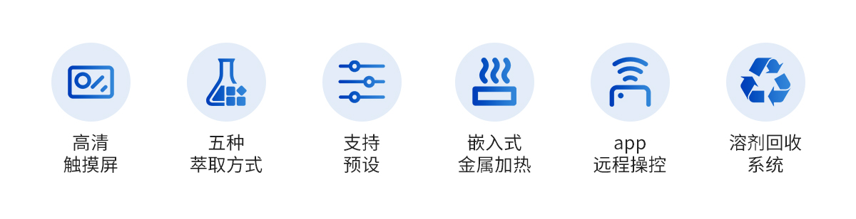 | ?全部有機溶劑均可使用,包括苯類、微類、酮類 等,滿足各種有機溶劑的使用條件 | ?采用全自動標準索氏萃取,全通道為玻璃與四氟材質,有效避免雜質的引入,準確性高 | ?可以app遠程操作控制,實現遠程通訊功能,方便客戶實時查看實驗允許情況 | ?采用一鍵開始與暫停操作,實驗過程掌控靈活 | ?外置壁掛型控制器,方便靈活,簡單快捷 | ?采用七寸大液晶觸摸屏控制,顯示屏具有折疊功能,不用時可以收起不占用空間 | ?五種萃取方式,滿足不同客戶萃取需求 | ?預設常用試劑選項,高頻次實驗一鍵輕松搞定 | ?整體嵌入式金屬加熱,升溫更快,效率更高 | ?進出水路溫度監控與流量控制,配合冷凝水有無實時監測,保證有機蒸氣冷凝回流無泄漏的效果下,節約水資源 | ?具有高-效的溶劑回收系統,有效減少試劑的浪費 |
