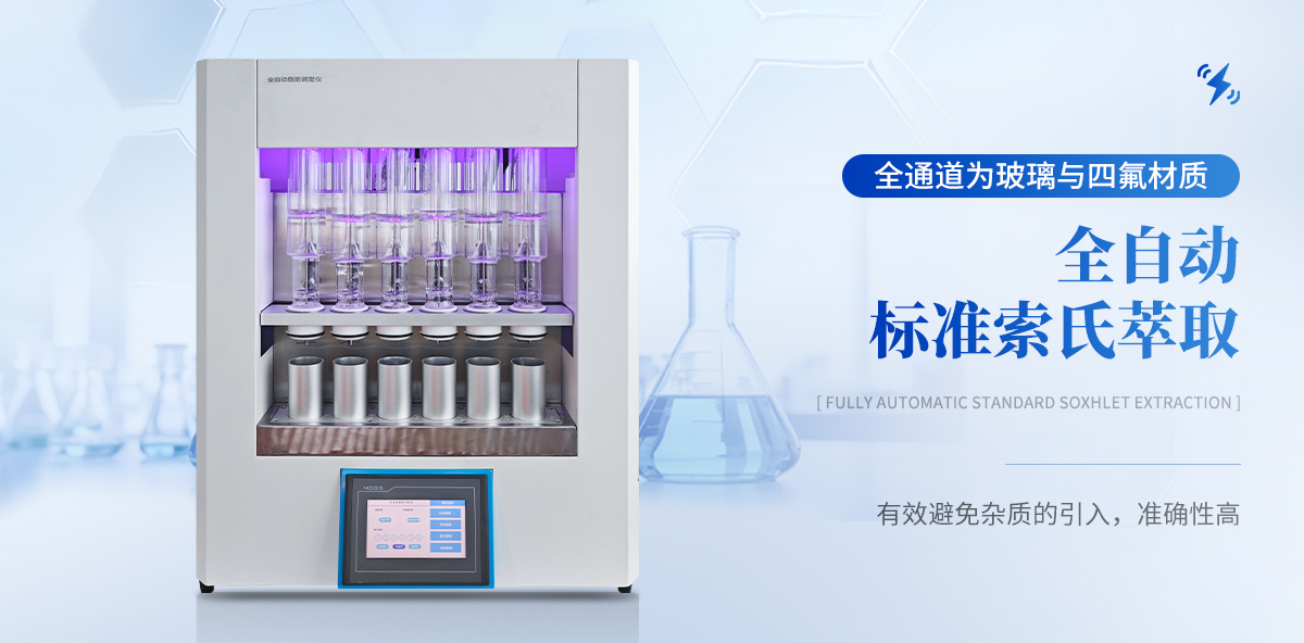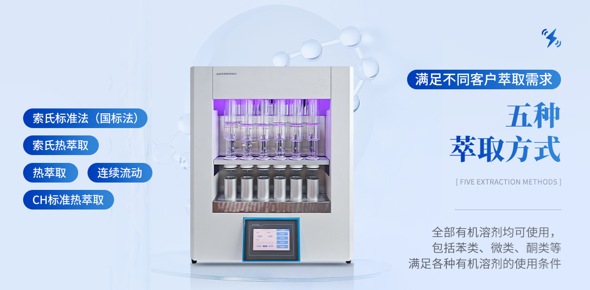 全自動脂肪測定儀(索氏提取儀)是根據索氏抽提原理,對脂肪等有機物進行萃取分離的儀器。儀器具有索氏標準法(國標法)、索氏熱萃取、熱萃取、連續流動及CH標準熱萃取等五種萃取方式;采用整體嵌入式金屬加熱,升溫快, 效果好,功耗低。安卓風格界面設計,豎屏外置壁掛式控制器,使操作更加簡便快捷;進出水路全方位溫度監控與流量控 制,更加環保與節約;內置乙謎泄漏檢測 裝置有效防止空氣污染,充分保障了實驗的安全性。