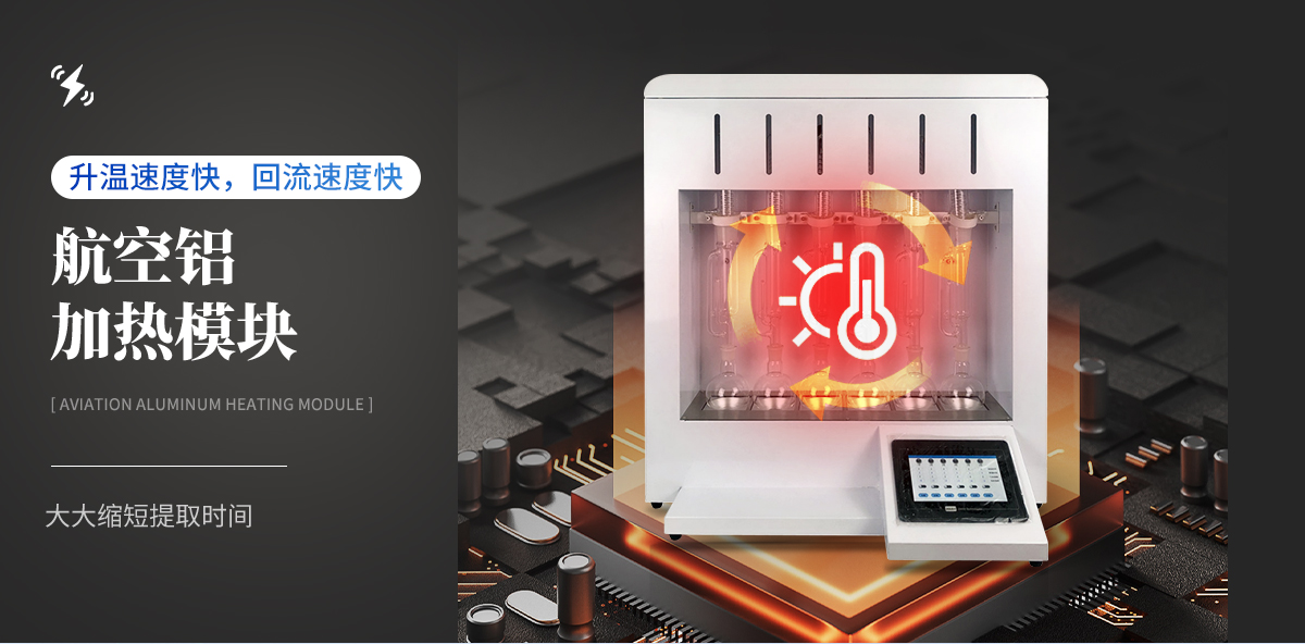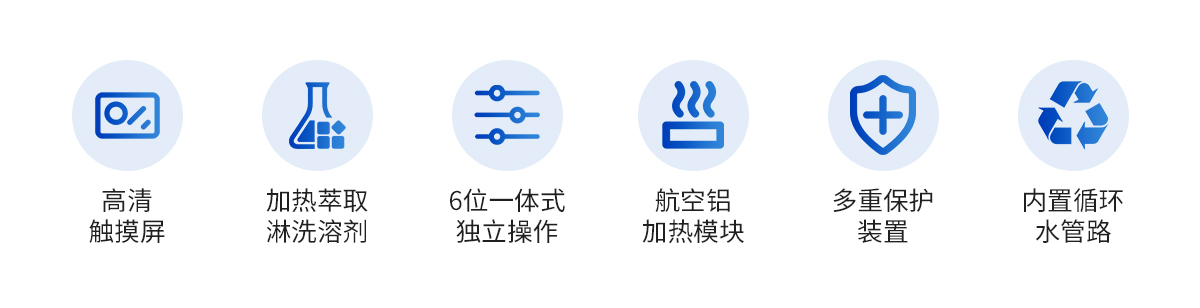 | 1.7英寸大液晶觸摸屏顯示控制,可升級程序控溫和遠程操作系統 | 2.6位一體式金屬浴加熱系統,保證每只樣品可獨立操作 | 3.航空鋁加熱模塊,升溫速度快,回流速度快,大大縮短提取時間 | 4.進口溫度傳感器,控溫精度高,均勻性好 | 5.自帶加熱萃取、淋洗溶劑回收功能,大大節約實驗耗材 | 6.內置循環水管路,操作簡單方便(可升級為內置冷卻裝置) | 7.具有過壓,過熱,漏電多重保護裝置,無需看管,保證機器長時間使用的安全性 | 8.可升級成內置冷水系統,無需外接水源。具有計時和時間控制的循環系統;冷卻水全自動控制。 |