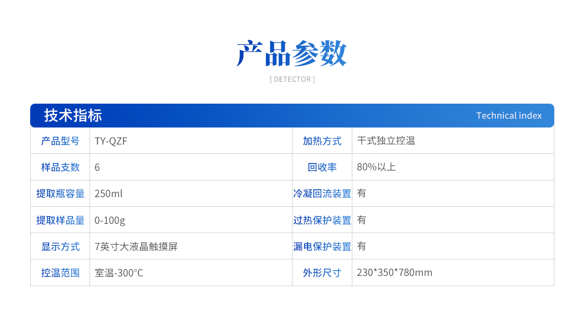 | 產品型號:TY-QZF 樣品支數:6 提取瓶容量:250ml 提取樣品量:0-100g 顯示方式:7英寸大液晶觸摸屏 控溫范圍:室溫-300°C 加熱方式:干式獨立控溫 回收率:80%以上 冷凝回流裝置:有 過熱保護裝置:有 漏電保護裝置:有 外形尺寸mm:230*350*780 |